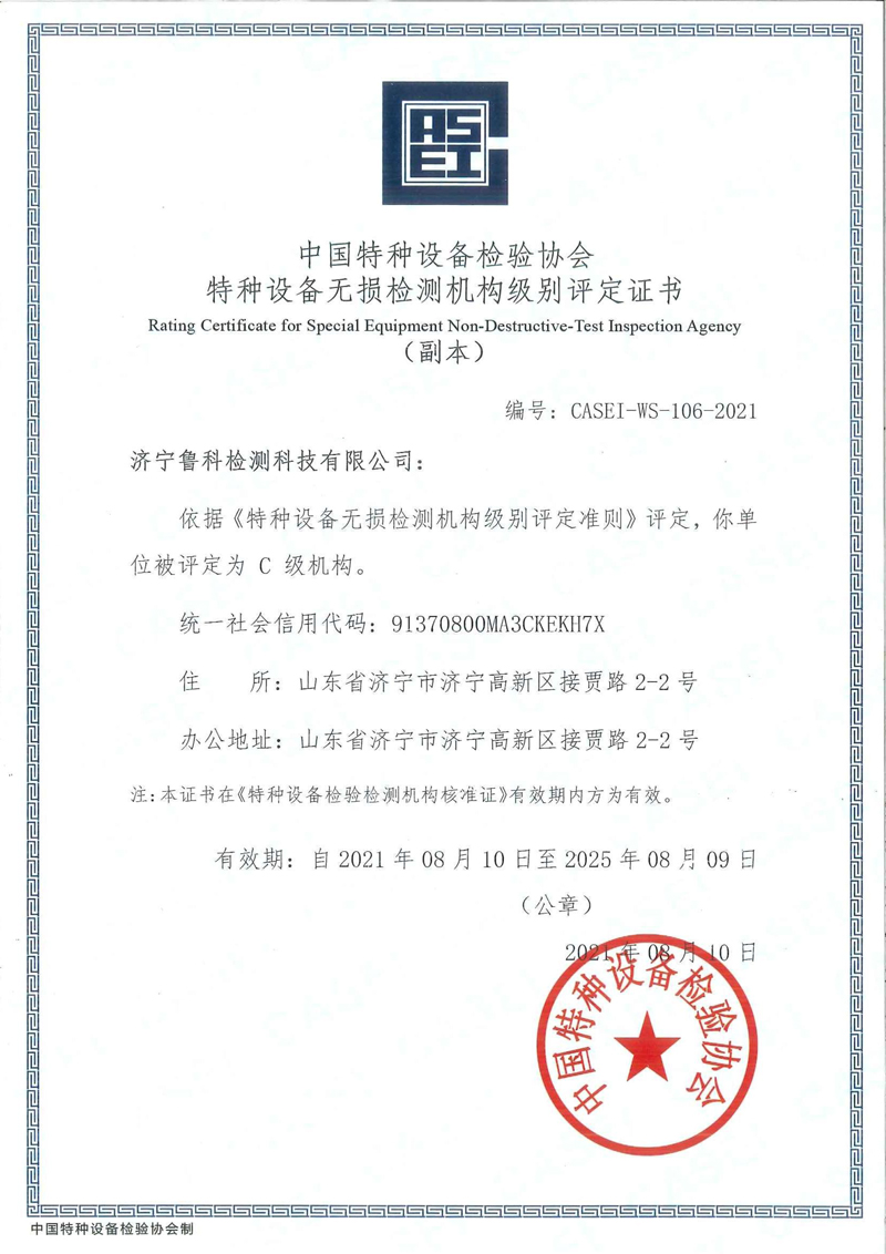2016年注冊濟(jì)寧魯科檢測科技有限公司,專注于行業(yè)的第三方檢測始終堅(jiān)持“科學(xué)、公正、誠信、高效”的質(zhì)量方針,并獲批中國特種設(shè)備檢驗(yàn)協(xié)會(huì)特種設(shè)備無損檢測機(jī)構(gòu)C級(jí)核準(zhǔn)單位