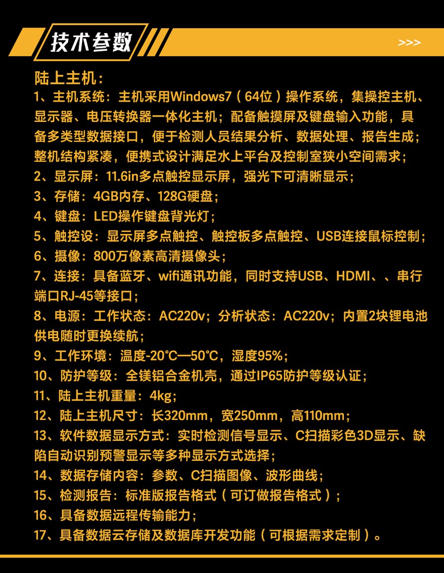 1、主機(jī)系統(tǒng):主機(jī)采用Windows7(64位)操作系統(tǒng),集操控主機(jī)、顯示器、電壓轉(zhuǎn)換器一體化主機(jī);配備觸摸屏及鍵盤輸入功能,具備多類型數(shù)據(jù)接口,便于檢測人員結(jié)果分析、數(shù)據(jù)處理、報告生成;整機(jī)結(jié)構(gòu)緊湊,便攜式設(shè)計滿足水上平臺及控制室狹小空間需求;
