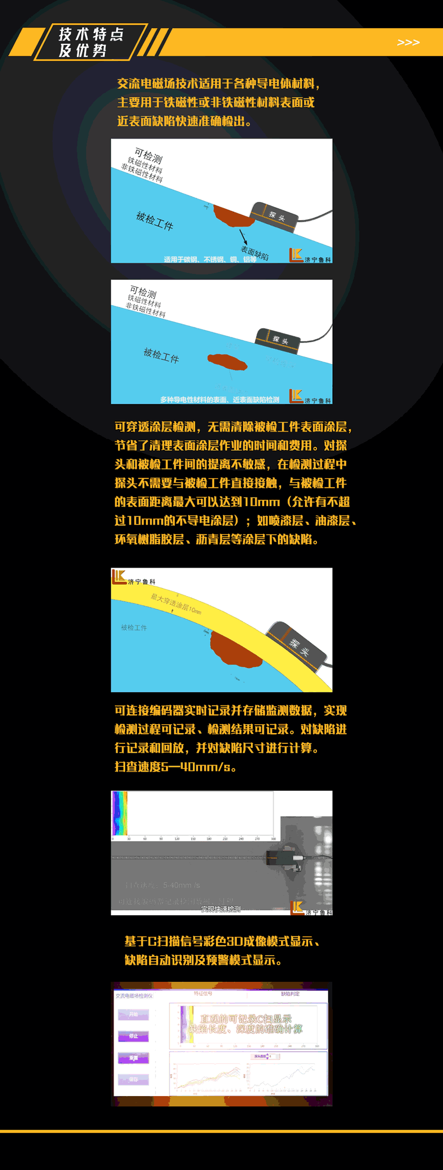1、交流電磁場檢測技術(shù)適用各種導(dǎo)電體材料,主要用于鐵磁性或非鐵磁性材料對于表面或近表面的缺陷可以快速準(zhǔn)確的檢出;