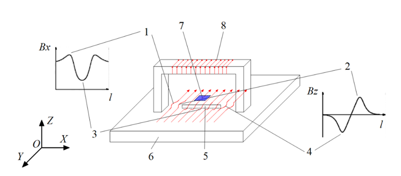 1-電流在裂紋兩端聚集時(shí),Bx出現(xiàn)凸起;2-電流在裂紋尖端順時(shí)針旋轉(zhuǎn)時(shí),Bz出現(xiàn)波峰;3-電流從裂紋底部經(jīng)過時(shí),Bx出現(xiàn)波谷;4-電流在裂紋尖端逆時(shí)針旋轉(zhuǎn)時(shí),Bz出現(xiàn)波谷;5-缺陷;6-待檢工件;7-傳感器;8-激勵(lì)線圈。