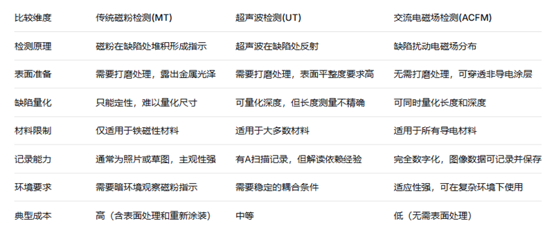要全面理解ACFM的技術(shù)優(yōu)勢(shì),有必要將其與石油化工領(lǐng)域常用的傳統(tǒng)檢測(cè)方法進(jìn)行系統(tǒng)比較。