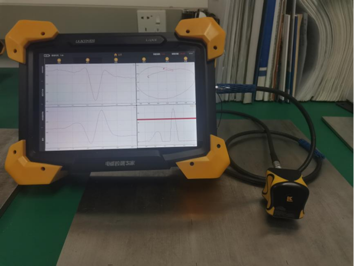 檢測設(shè)備采用國產(chǎn)LKACFM-X2型交流電磁場檢測儀,ACFM檢測儀如圖2左側(cè)所示,檢測探頭為常規(guī)標(biāo)準(zhǔn)探頭,沒有搭配編碼器,如圖2右側(cè)所示,由雷莫線與儀器相連。