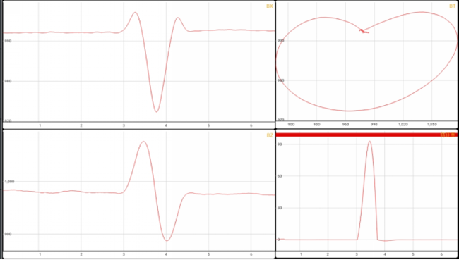 從檢測結(jié)果來看,Bx有明顯的波谷特征,Bz有波峰和波谷,蝶形圖閉合成圓形,圖像為典型缺陷圖像,且無缺陷處近乎于一條直線。對于鋁平板缺陷來說,ACFM有很好的檢測效果。
