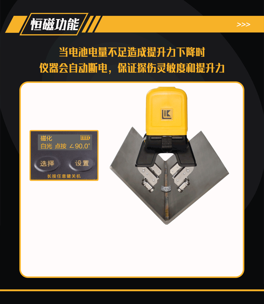 6、恒磁控制功能,因電量下降導(dǎo)致提升力不滿足探傷需求時(shí)自動(dòng)斷電,保證探傷靈敏度;
